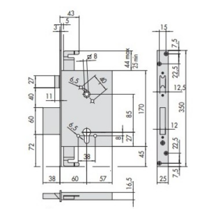 Cerradura embutida CISA modelo 57250 de golpe y llave, de gorjas de doble pala.