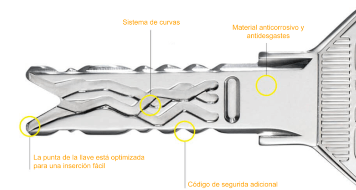 Dispone de una tecnología patentada con llave de regatas curvadas y cilindro de pitones sin muelles, por lo que no requiere mantenimiento y con máxima suavidad de entrada de llave.