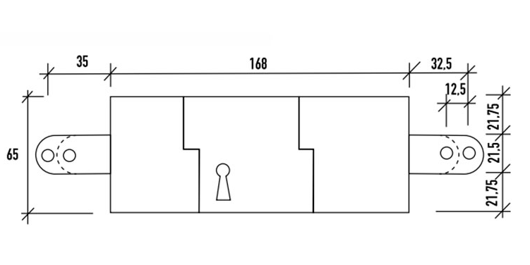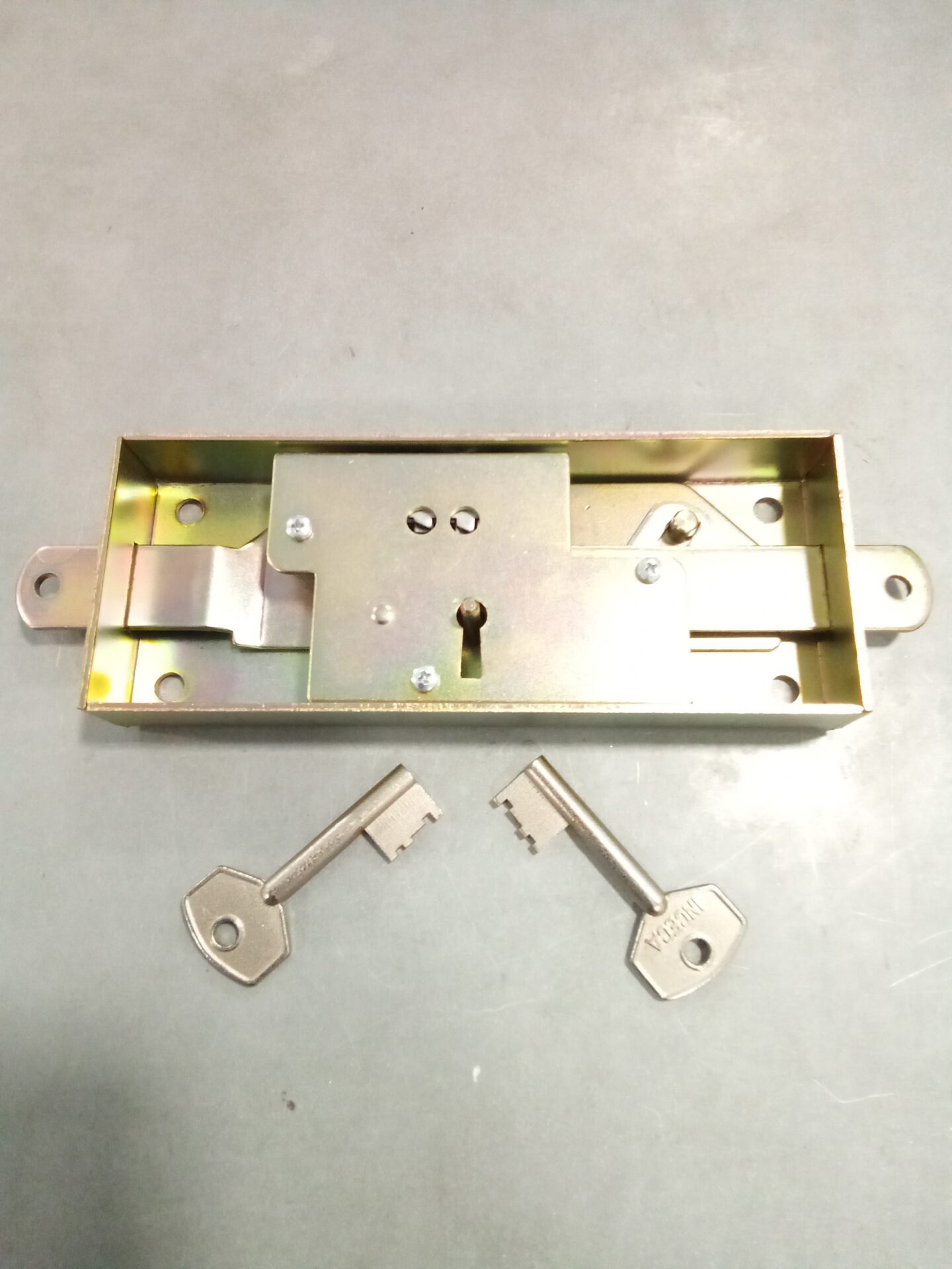 Cerradura central de persiana INCECA 201 pestillos fuera. Medidas 65 x 168 x 23 mm. Suministrada con 2 llaves de gorjas.