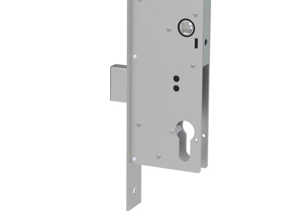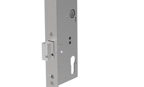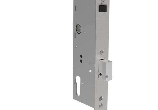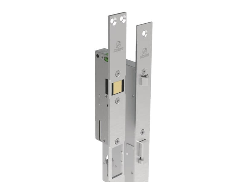 Cerradura electromecánica DORCAS DUO con cierre automático con vuelta de llave, apertura interior antipánico y apertura eléctrica desde interfonos.