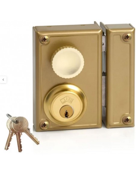 Cerradura JIS Modelo 34/7 sobrepuesta de golpe y llave. Suministrado con tres llaves de serreta. Mano: derecha e izquierda. Acabado dorado.