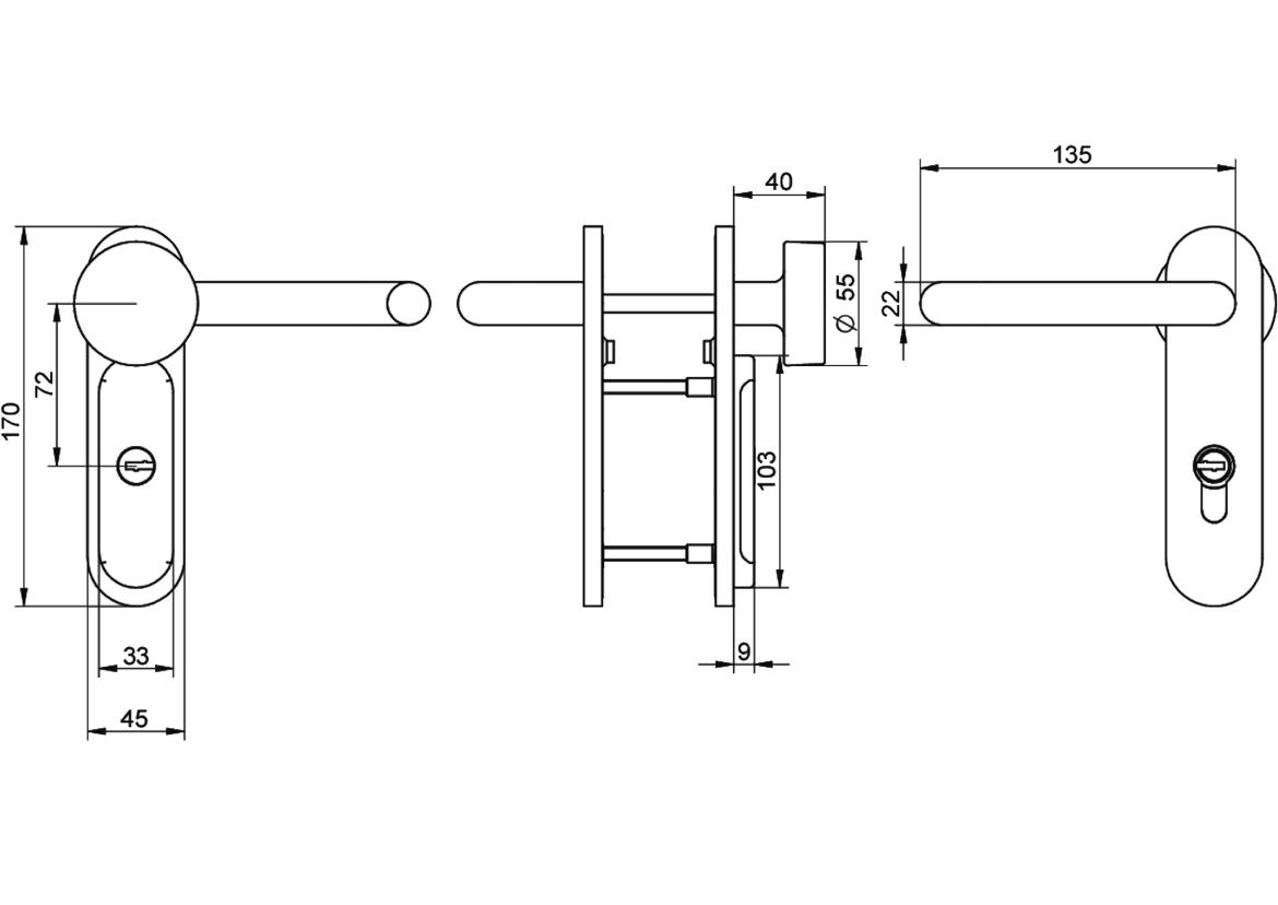 El KIT SCUTUM RF es un conjunto compuesto por un juego de pomo fijo-maneta reforzadas con un escudo y una contra placa de alta protección.