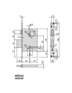 Cerradura central de persiana INCECA Modelo 200 pestillos dentro. Medidas 65 x 168 x 23 mm. Suministrada con 2 llaves de gorjas.